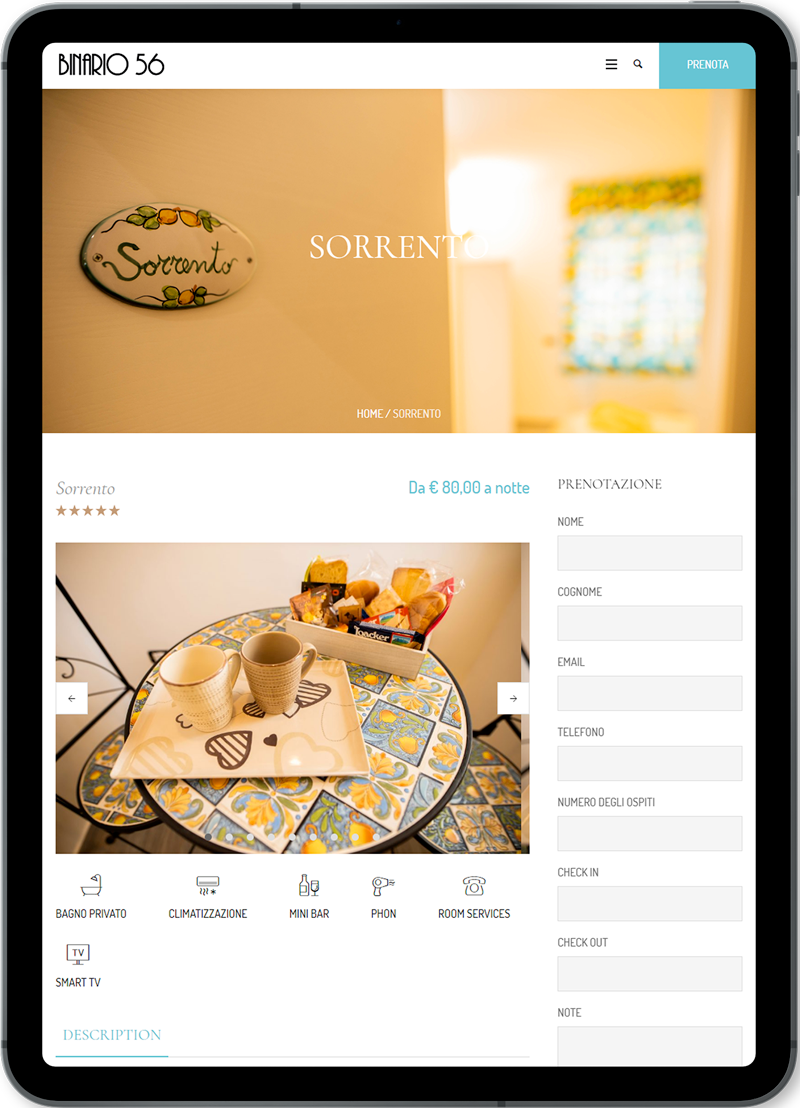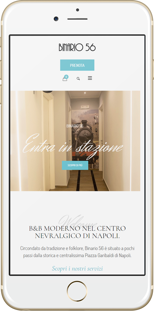 Nello sviluppo di questo portale di booking, il team creativo della 3d0 ha immaginato un layout in linea con il concept di arredo del b&b, richiamando dal punto di vista cromatico i colori delle tre stanze dedicate a Sorrento, Pompei e Positano, e nei contenuti la location tipicamente ferroviaria di Binario 56.