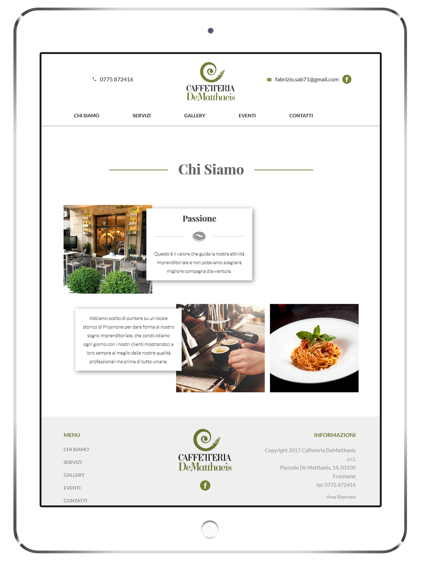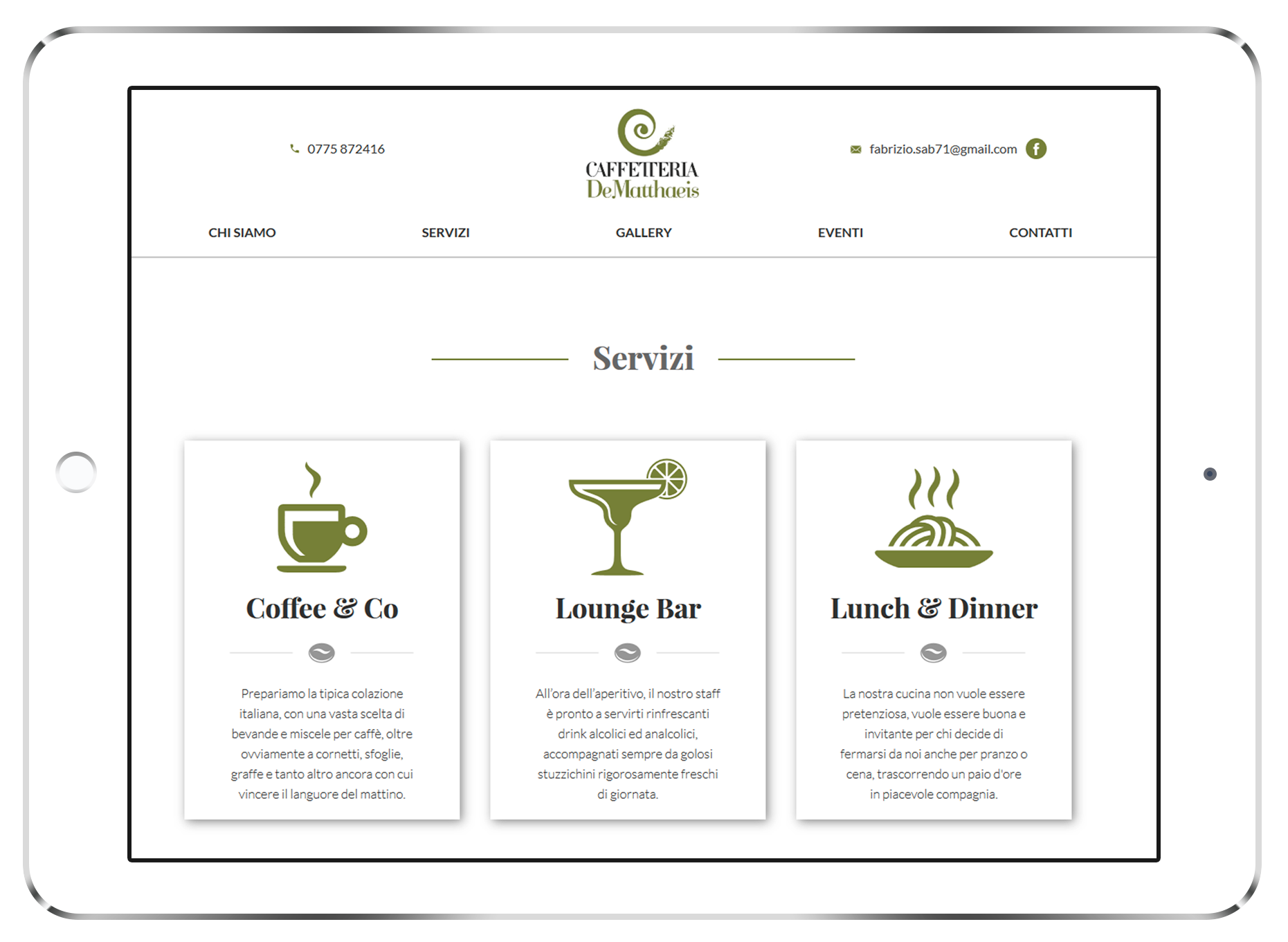 Un sito web talvolta deve essere nient’altro che la testimonianza online di un’esperienza vissuta offline. Un’esperienza sicuramente piacevole quella offerta dalla Caffetteria DeMatthaeis, altrettanto lo sarà per gli internauti accedere al sito vetrina realizzato dalla 3d0, che ha riprodotto con minuziosità lo stile e l’eleganza moderna ma mai distaccata di questo locale di Frosinone, raccontato attraverso foto ed eventi organizzati nella caffetteria.