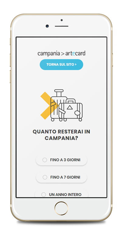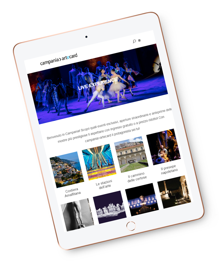 Campania>artecard è il pass turistico che consente di visitare Napoli e la Campania, con accesso privilegiato ad oltre 80 luoghi della cultura. Attraverso un vantaggioso e variegato sistema di servizi, dal biglietto integrato per i trasporti ad inviti ad eventi esclusivi, l’utente viene guidato nella scelta dell’itinerario più adatto ai propri interessi che si traduce nell’acquisto di una o più card create ad hoc.