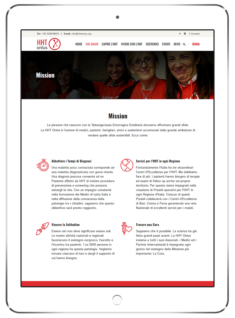 Lavorare con lo staff della HHT Onlus ha rappresentato un'immersione formativa in una realtà patologica ancora poco conosciuta nel nostro Paese, ma soprattutto la professionalità e la disponibilità delle persone che stanno dietro questa organizzazione hanno consentito al team della 3d0 di approcciarsi al progetto di restyling del loro website con leggerezza creativa ed entusiasmo operativo.
