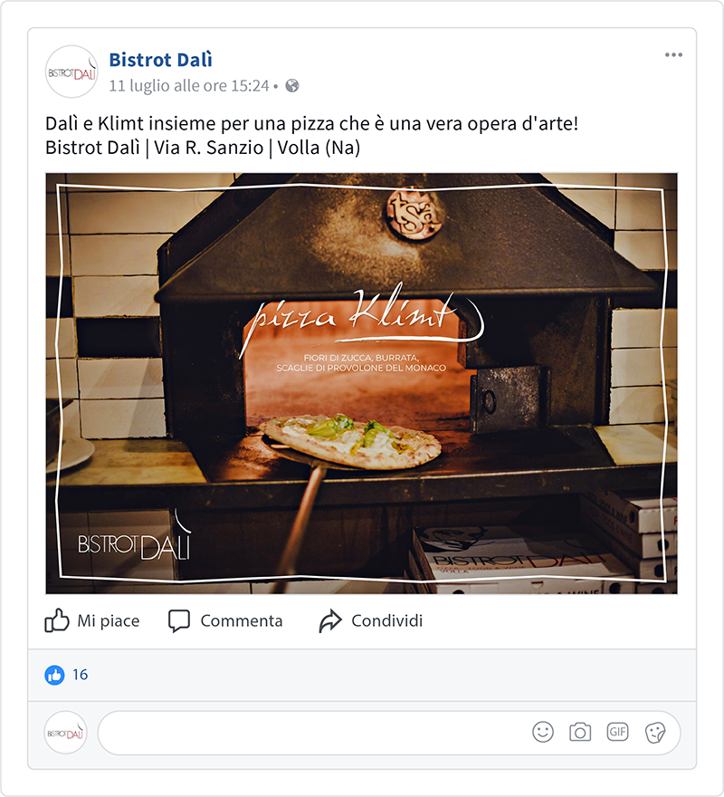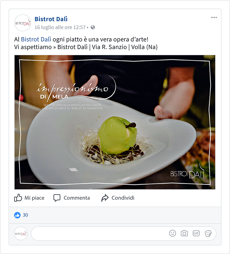 Il Bistrot Dalì seleziona le materie prime tra prodotti tipici campani e della zona vesuviana. Alimenti freschi e a chilometro zero, come i friarielli dell’orto di famiglia, i pomodorini del Piennolo e la pasta del pastificio artigianale Leonessa. Il Bistrot può accogliere fino a 150 persone, in 2 grandi sale in cui si mescolano design, arte e tipicità regionali.