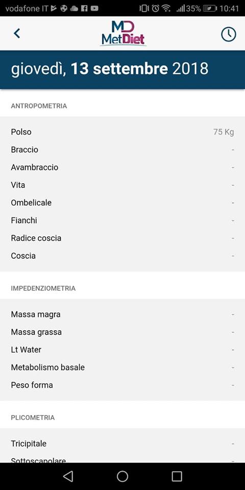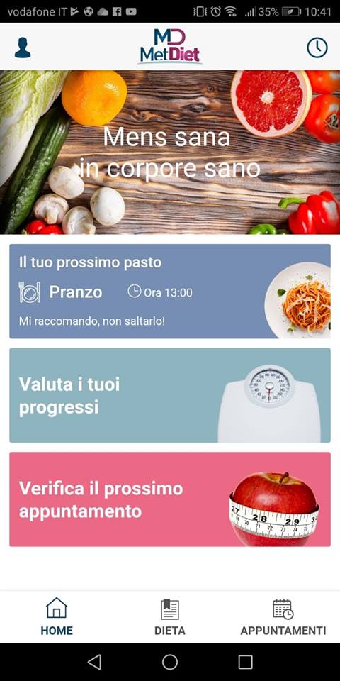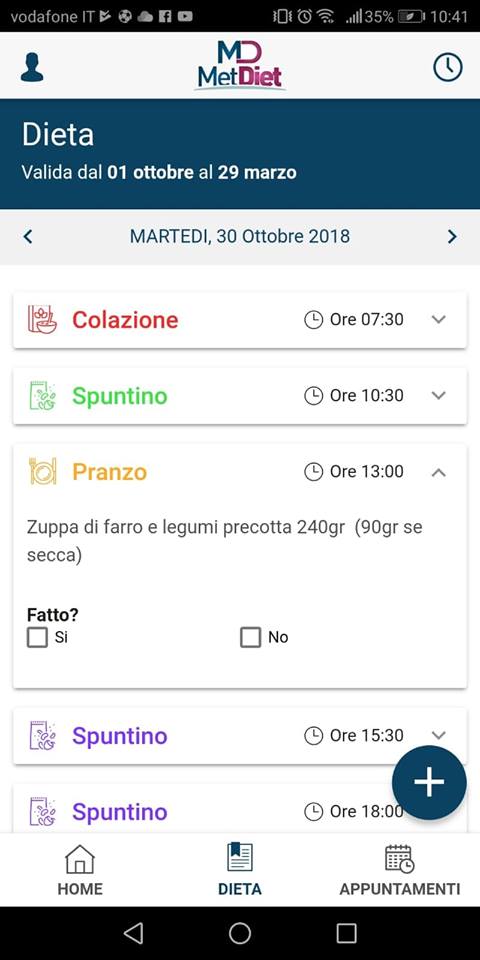 Metdiet è un app per il monitoraggio e la gestione della tua dieta personalizzata preparata dal Dott. Aniello Moccia, biologo nutrizionista. Partendo dalle indicazioni fornite dal tuo dietologo durante i vostri incontri in sede, potrai controllare i pasti previsti dalla dieta del giorno direttamente dal tuo smartphone. L’applicazione ti invierà un “remind” per ogni pasto successivo e ti consentirà inoltre di ampliare la giornata aggiungendo uno o più spuntini consigliati dal tuo dietologo. Infine avrai sempre la possibilità di osservare l’andamento del peso nel corso del tempo e di visionare i tuoi prossimi appuntamenti.