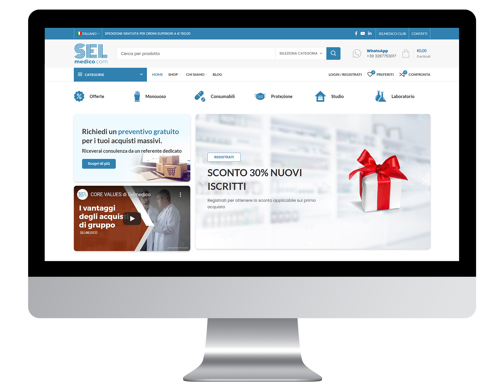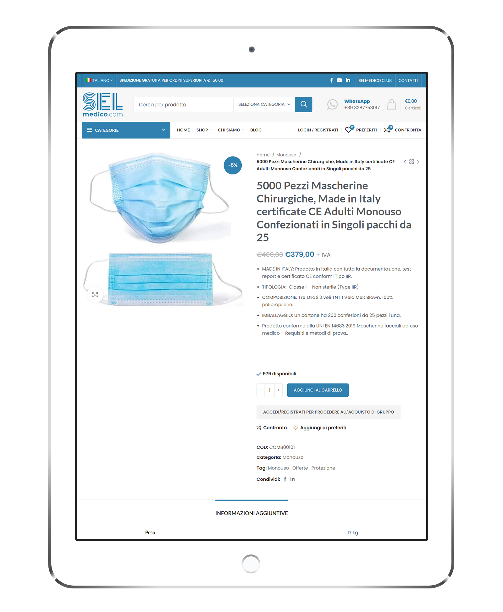 Selmedico.com è un portale di e-commerce B2B che offre un servizio di acquisto di gruppo per operatori sanitari, istituzioni e aziende. La piattaforma permette di effettuare acquisti garantiti e sicuri di dispositivi medici e prodotti della salute nel pieno rispetto dei requisiti richiesti dall’UE.