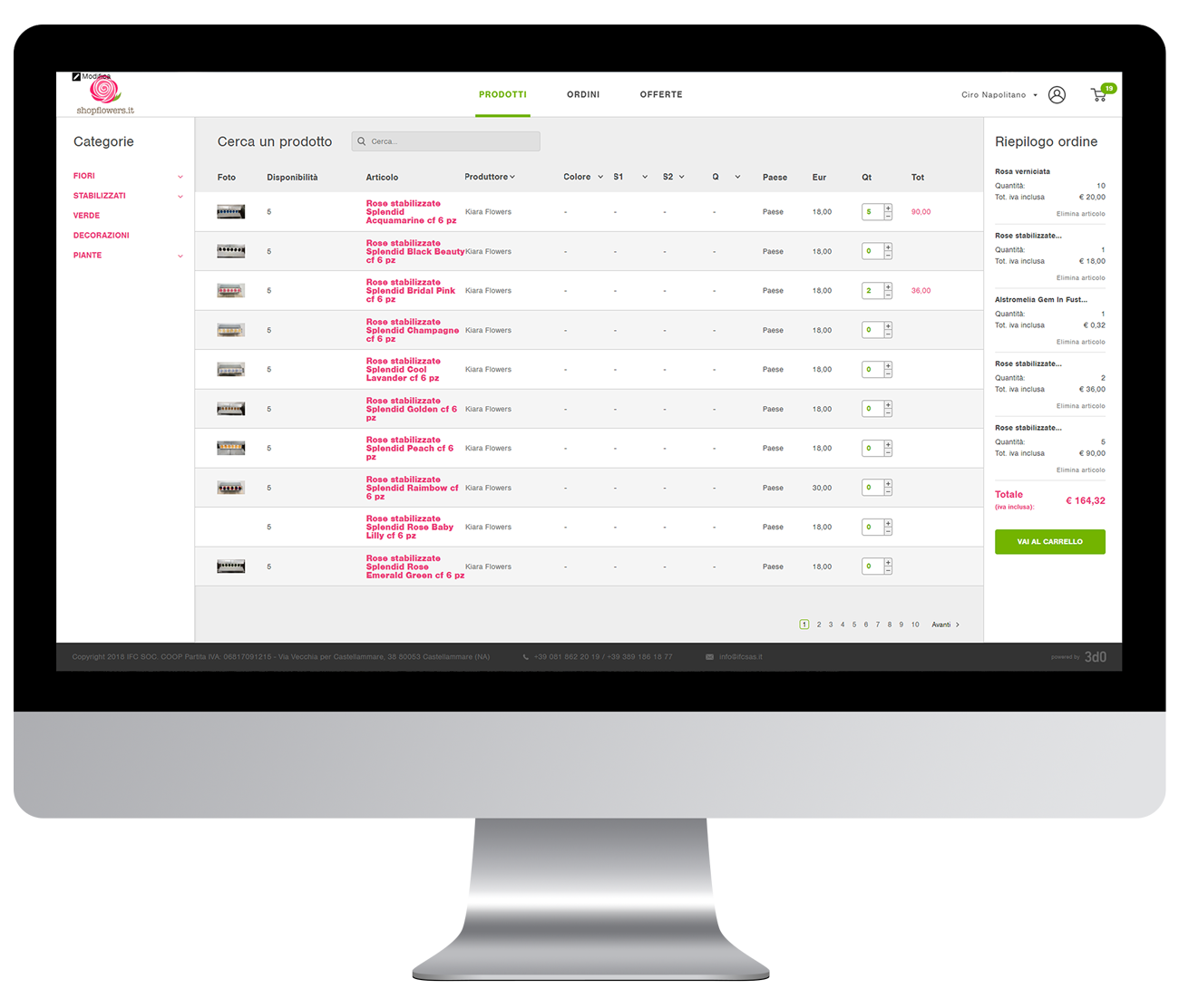I reparti di creatività e sviluppo della 3d0 hanno lavorato a stretto contatto per realizzare il complesso gestionale business to business ordini.shopflowers.it, rivolto ai grossisti di fiori e piante, con oltre cento articoli a catalogo suddivisi in più categorie ed una vetrina delle offerte più convenienti.