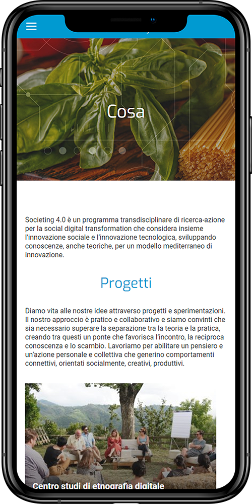 Societing 4.0 è un programma transdisciplinare di ricerca-azione per la social digital transformation che considera insieme l’innovazione sociale e l’innovazione tecnologica, sviluppando conoscenze, anche teoriche, per un modello mediterraneo di innovazione.