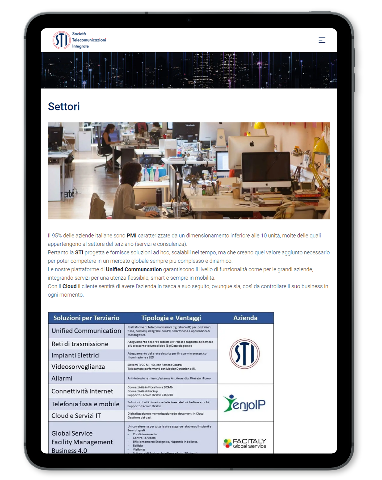 La STI – Società Telecomunicazioni Integrate, opera principalmente nel settore delle Telecomunicazioni con l’obiettivo di raggiungere la massima soddisfazione del cliente offrendo soluzioni a valore aggiunto. Partendo dall’analisi dell’infrastruttura esistente del Cliente, la STI propone soluzioni scalabili nel medio termine che attraverso successive integrazioni possano condurre all’efficienza di tutta l’organizzazione ed in particolare del proprio business.