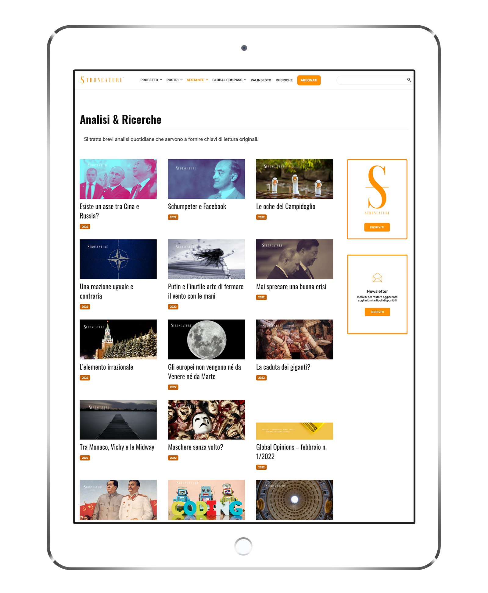 Stroncature è un progetto editoriale libero ed indipendente con un triplice obiettivo: fornire ai suoi abbonati degli strumenti che siano utili a leggere quanto sta accadendo a livello sociale, politico, economico e tecnologico; produrre analisi non mainstream, approfondimenti e riflessioni sul futuro della società digitale; creare un luogo dove studiosi, ricercatori, innovatori e creativi possano discutere e diffondere i frutti della propria attività intellettuale.