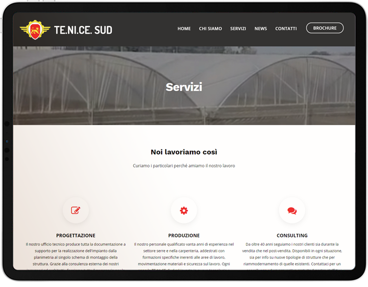 La TE.NI.CE. SUD è una società che opera da oltre 40 anni nel settore "serre", vantando una produzione di diverse centinaia di ettari annui coperti un po' in tutto il territorio nazionale ed estero, ed è sicuramente un prodotto che abbina al meglio la qualità dei materiali alla funzionalità delle strutture.